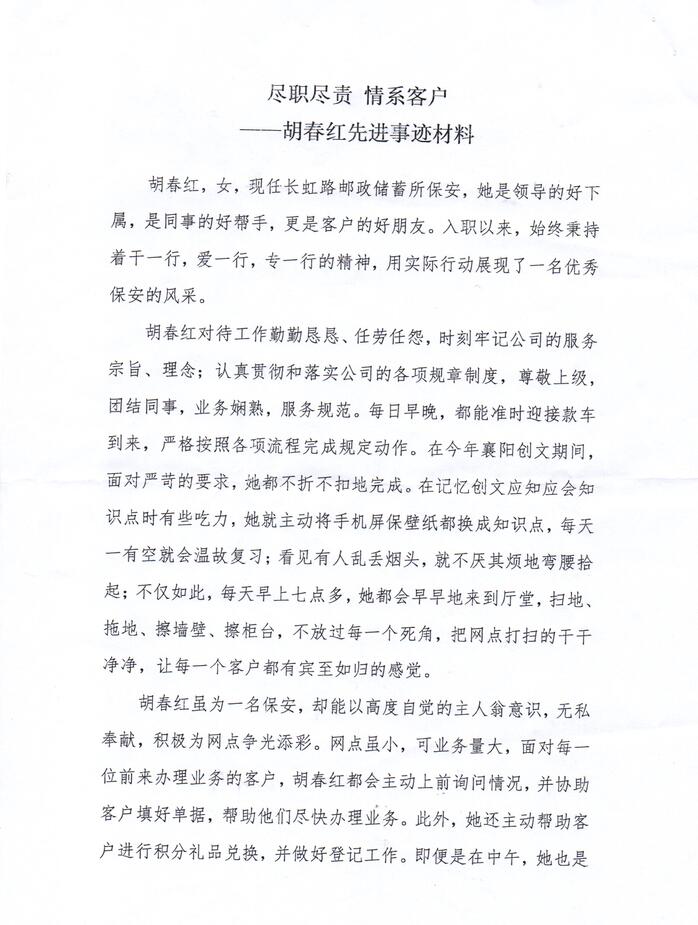 胡春紅,女,現(xiàn)任長虹路郵政儲蓄所保安,她是領導的好下屬,是同事的好幫手,更是客戶的好朋友。入職以來,始終秉持著干一行,愛一行,專一行的精神,用實際行動展現(xiàn)了一名優(yōu)秀保安的風采。胡春紅對待工作勤勤懇懇、任勞任怨,時刻牢記公司的服務宗旨、理念;認真貫徹和落實公司的各項規(guī)章制度,尊敬上級,團結同事,業(yè)務嫻熟,服務規(guī)范。每日早晚,都能準時迎接款車到來,嚴格按照各項流程完成規(guī)定動作。在今年襄陽創(chuàng)文期間,面對嚴苛的要求,地都不折不扣地完成。在記憶創(chuàng)文應知應會知識點時有些吃力,她就主動將手機屏保壁紙都換成知識點,每天有空就會溫故復習:看見有人亂丟煙頭,就不厭其煩地彎腰拾起;不僅如此,每天早上七點多,她都會早早地來到廳堂,掃地拖地、擦墻壁、擦柜臺,不放過每一個死角,把網(wǎng)點打掃的干干凈凈,讓每一個客戶都有賓至如歸的感覺。胡春紅雖為一名保安,卻能以高度自覺的主人翁意識,無私幸獻,積極為網(wǎng)點爭光添彩。網(wǎng)點雖小,可業(yè)務量大,面對每位前來辦理業(yè)務的客戶,胡春紅都會主動上前詢問情況,并協(xié)助客戶填好單據(jù),幫助他們盡快辦理業(yè)務。此外,她還主動幫助客戶進行積分禮品兌換,并做好登記工作。即便是在中午,她也是匆忙吃過飯后,主動放棄午休,繼續(xù)投入到工作中。由于網(wǎng)點只能辦理金融業(yè)務,有些客戶不知情,進店詢問郵務類業(yè)務,甚至只是嚼水、問路,胡春紅都會熱情迎客,耐心解答,做到知無不言,言無不盡視客戶如親人,這是胡春紅一直堅持的信念,對待每位客戶胡春紅都做到了來有迎聲,走有送聲,不僅如此,她還想客戶之所想,急客戶之所急她所在的網(wǎng)點有兩位特殊的客戶,由于偏癱,每月都必須由年邁的母親騎著三輪車帶女幾來領低保,母親沒有什么文化,也不會寫字,每次母女兩剛到門口,胡春紅都會馬上迎出門去,攙扶客戶進店,幫助客戶填單,同時還會噓寒問暖,問問母女兩有沒有什么困難需要幫助??蛻羰指屑?多次提出送點禮物給胡春紅,也都被她一一謝絕了。