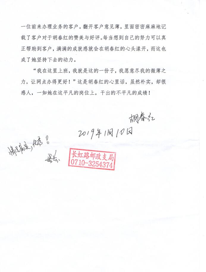 還有一次,一對老夫妻來網(wǎng)點辦理業(yè)務,老大大心臟病突發(fā),動彈不得,胡春紅二話沒說撥打了120急救電話,又是遞上熱水又是幫忙攙扶她到座椅上休息,然后,她想也沒想就跑到最近的藥店,自費買了一盒速效救心丸,在稍事休息后老太大有所好轉(zhuǎn)事后,老兩口多次來到網(wǎng)點要把藥費還給胡春紅,都被她拒絕了,最終,老大大親自寫了整整兩頁紙的感謝信,交到了胡春紅手中。將客戶遺失在網(wǎng)點的物品及時收起來,妥善保管,待客戶來時物歸原主;主動給客戶講解宣傳存款政策,幫助網(wǎng)點提升業(yè)績……這樣的事跡還有很多,胡春紅用她的熱情、真誠感染著每一位前來辦理業(yè)務的客戶。翻開客戶意見薄,里面密密麻麻地記載了客戶對于胡春紅的贊美與好評,每當想到自已的努力可以真正幫助到客戶,滿滿的成就感就會在胡春紅的心頭漾開,而這也成了她堅持下去的動力。“我在這里上班,我就是這的一份子,我愿意盡我的微薄之力,讓網(wǎng)點辦得更好!”這是胡春紅的心里話,雖然樸實,卻很感人,一如她在這平凡的崗位上,干出的不平凡的成績!